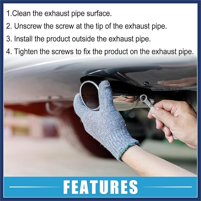 【耐久性高い】: 取り付け - 1. 排 気管の表面をきれいにします.2. 排 気管の先端のネジを緩めます.3. 製品を排 気管の外側に取り付けます.4. ネジを締めて製品を排 気管に固定します.