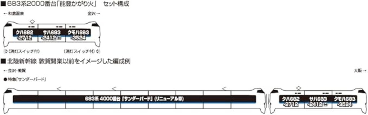 「能登かがり火」はもちろん、683系各種製品と併結して北陸新幹線敦賀開業以前の特急「サンダーバード」を再現するのもオススメです。