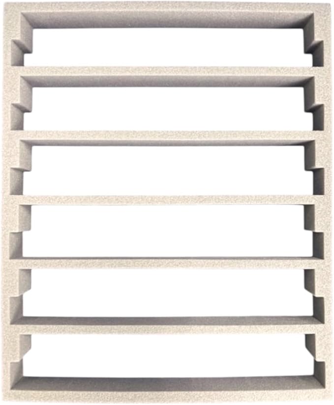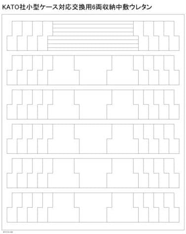 KATO小型ケース(10‐212)に対応する純正交換用の中敷ウレタンです。車両が6両収納できます。穴の大きさと付属のスペーサーの組み合わせで新幹線車両から2軸貨車やBトレインショーティーなどの小型車両まで幅ひろく対応します。大型車両は屋根上機器などが干渉する場合があります。