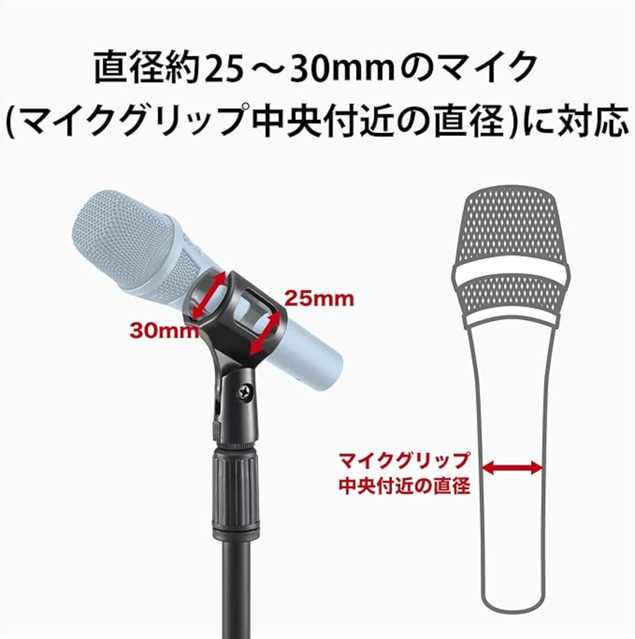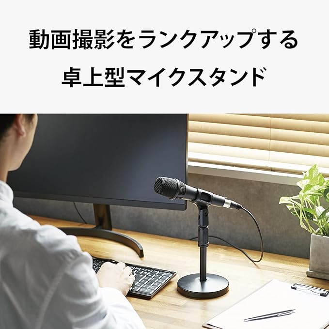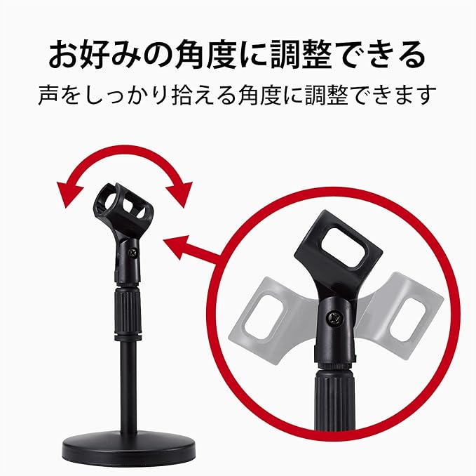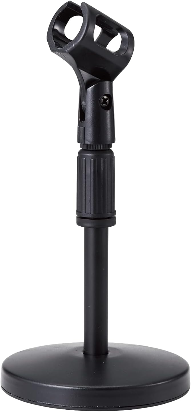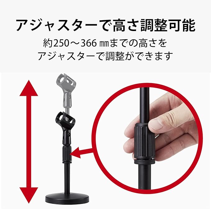 ■動画撮影をランクアップする卓上型マイクスタンドです。 ■伸縮する支柱にマイクを装着して、お好みの高さに調節できます。 ■アジャスターで高さ調節がラクラク可能です。 ■ホルダー部は角度調節可能なため、お好みの角度で使用可能です。 ■少し重みのある円形の台座は、支柱が台座の中心にあるため安定感があり倒れにくいです。 ■直径約25~30mmのマイク(マイクグリップ中央付近の直径)に対応しています。