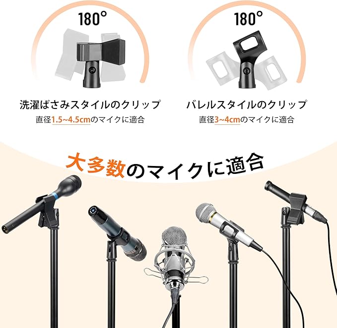 【収納バッグ&2種マイクホルダー付属】持ち運びに便利な収納バッグ付き。バレル型とクリップ型の2種類のマイクホルダーが付属し、Shure SM58 / SM48 / PGA48 / Samson Q2U / HyperX QuadCast など、さまざまなマイクに対応します。