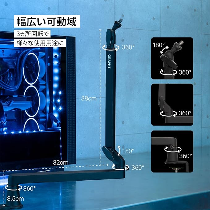 ✅【幅広い可動域で簡単に調整可能】 3ヵ所の360度回転と150度の垂直回転を備えています。これによりあらゆる位置や角度にマイク位置を固定することが可能です。 さらに全ての回転はドライバー等を使わずに調整が可能です。