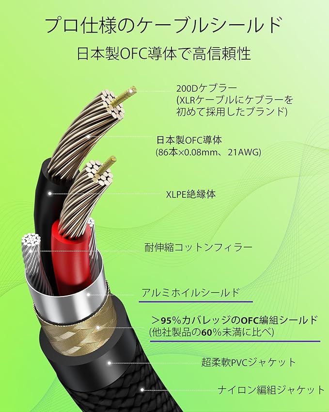 【5重シールド構造】99.99% 高純度無酸素銅芯線アルミホイル層でEMI/RFIノイズを徹底ブロック。触れてもノイズなし、よりクリアな音質を伝送します。