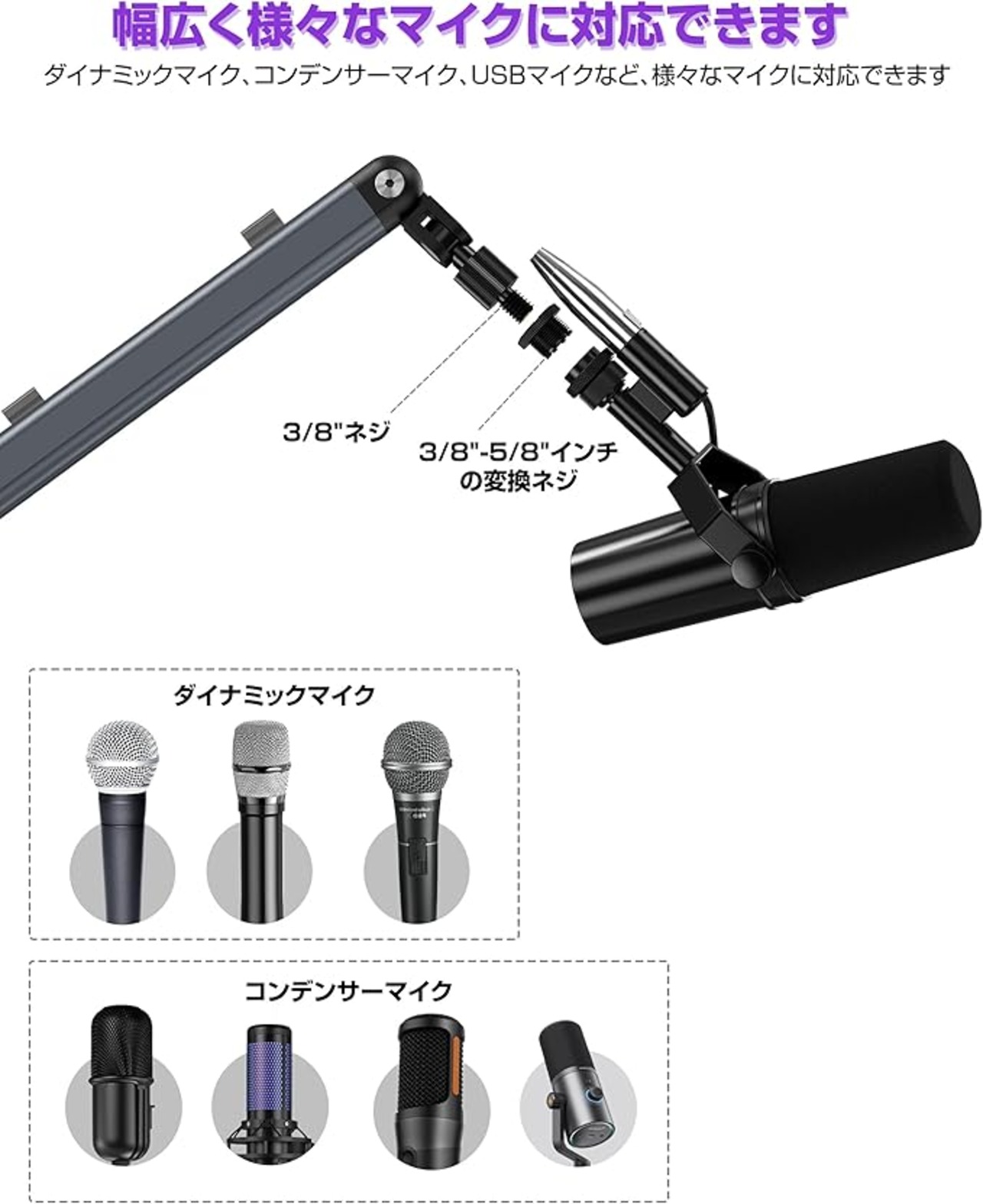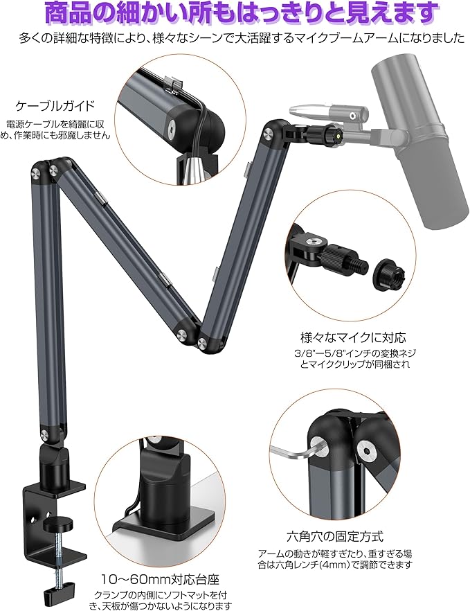 【幅広くマイクが対応】3/8"-5/8"インチの変換ネジとマイククリップがセットされており、ダイナミックマイク、コンデンサーマイク、USBマイクなど、様々なマイクに対応できます。それにも、マイククリップの直径は3∼5cmで、サイズに合うマイクを差し込んで取り付けでき、すぐに利用できます。(※:アームの使用角度を決まったら、各可動関節のボルトを確実に締めてください。)