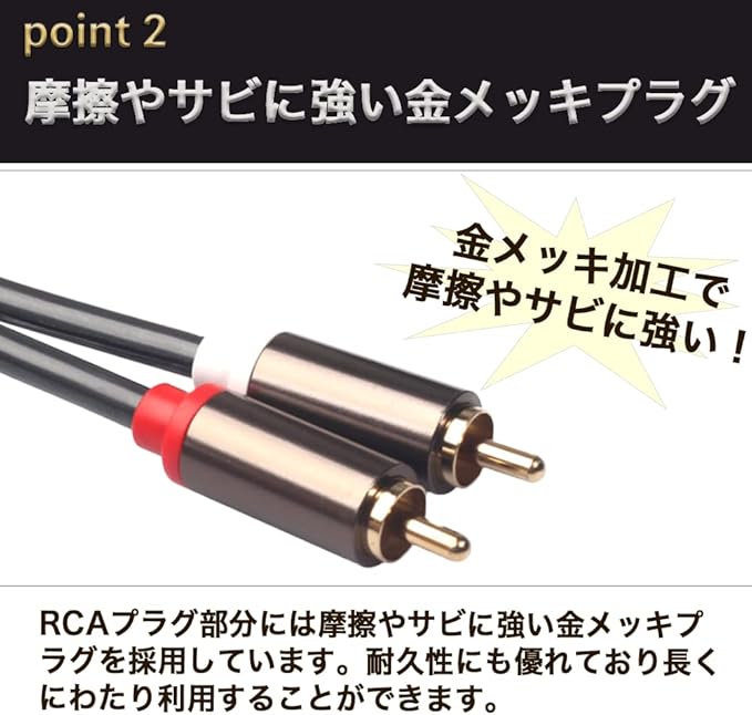 【摩擦に強い金メッキプラグ採用】RCA端子には金メッキ処理を施したプラグを採用しており、摩擦やサビに強く長期間安心して使用することができます。経年劣化も少なく長く安定して利用可能となっています。