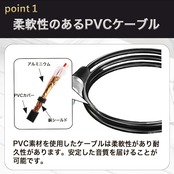 【柔らかく柔軟性のあるPVC素材ケーブル】ケーブル部分には柔軟性があるPVC素材を使用しています。柔らかい素材ではありますが耐久性は抜群で安定した音質を届けることができます。