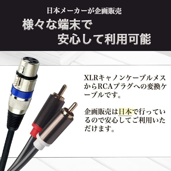 【幅広い互換性のXLR変換ケーブル】2RCAプラグから2XLRプラグへの変換ケーブルです。アンプやオーディオ機器などRCAプラグのデバイスからスピーカーなどに音声を伝達することができます。