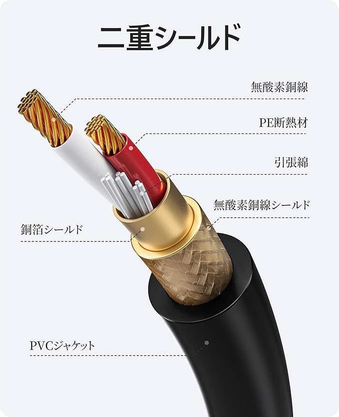 【優れた音質】純銅導体、高品質金メッキプラグ、純銅編組とアルミニウム箔による二重シールド。優れた抗干渉機能により、音声信号をダメージから守り、超クリアなロスレス音声出力を実現します。