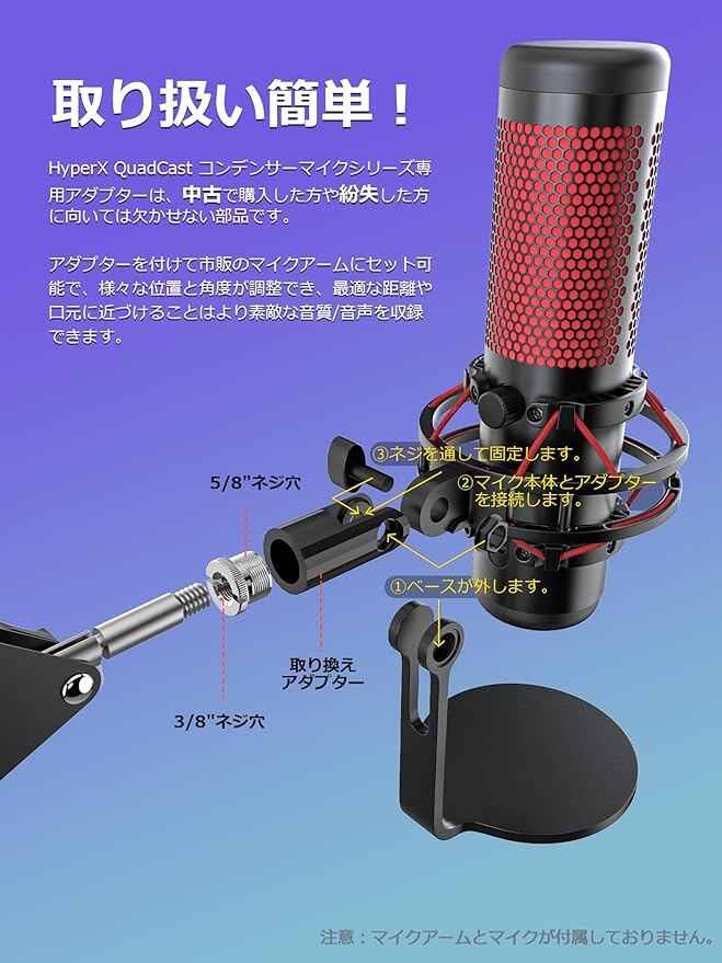 HyperX QuadCast/HyperX QuadCast S用マイクマウントアダプター HyperXマイク交換用アダプター 3/8"-5/8"インチ変換ネジ付き 取り付け簡単 HyperXマイク専用アダプター マイクスタンド3/8インチHyperXブームアーム