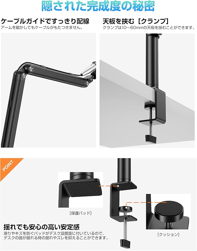【合金製・ケーブルガイド付き】スタンドは頑丈な炭素鋼とアルミ合金製で、精密加工と研磨、サンドブラスト仕上げにより高級感があります。厚さ10〜60mmの天板に対応し、クランプ部のシリコンパッドでデスクを傷から守ります。アームにはケーブルガイドを備え、常時給電ケーブルもすっきり配線できます。