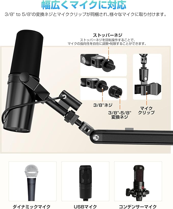【幅広いマイクに対応】3/8インチ〜5/8インチ変換ネジとマイククリップを付属し、ダイナミックマイク、コンデンサーマイク、USBマイクなどに対応します。マイククリップの直径は約3〜5cmで、サイズに合うマイクを差し込んで取り付けできます。