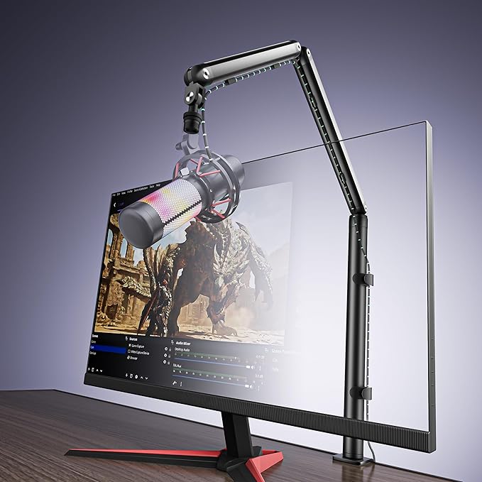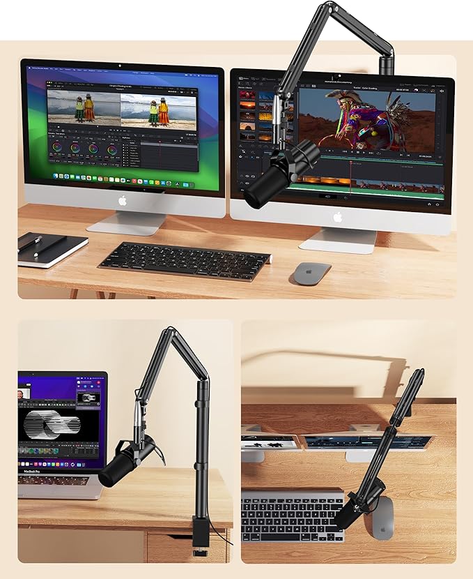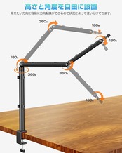 【360 回転・高さ40cm】従来のマイクスタンドは机の側面設置が多く、スペースを取りがちですが、本品は直径30mm・長さ350mmの延長パイプ付きで、モニター越しの背面スペースも有効活用できます。収録、動画配信、生配信、オンライン授業、カラオケ、楽器演奏、宅録など幅広い用途に活躍します。
