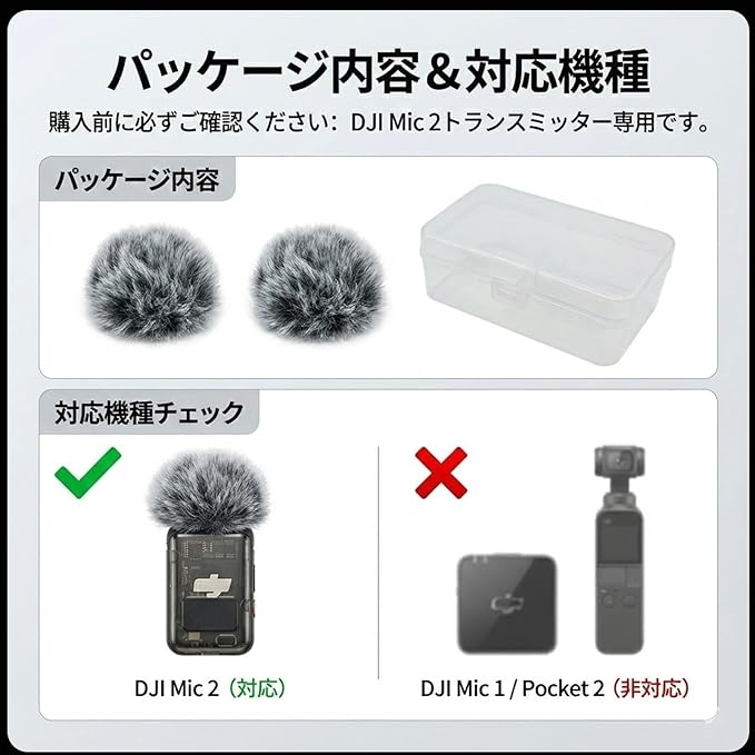 パッケージ内容: DJI Mic 2 トランスミッター用ウィンドスクリーン 2個,透明収納ボックス1個(その他は含まれません)