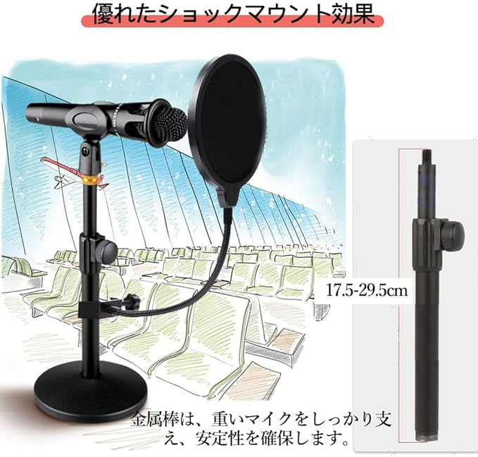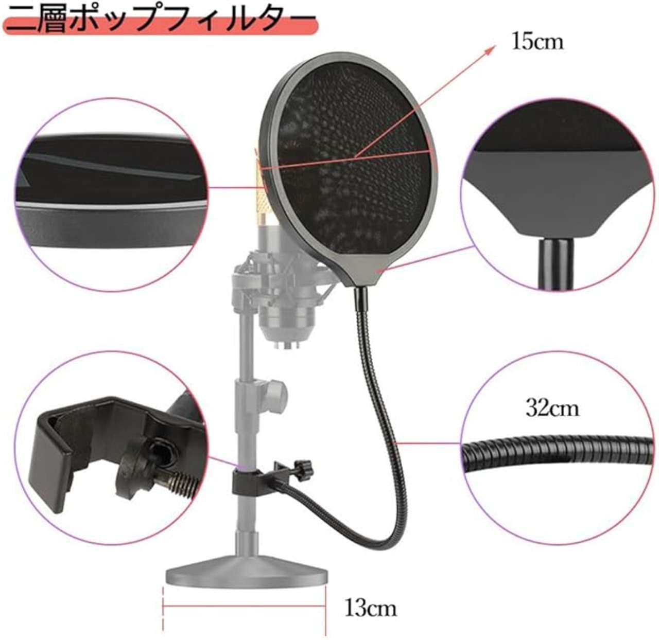 サムコス 卓上マ イクスタンド マイクスタンド デスクトップマイクスタンドセット マイククリップコンデンサーマイク用 ノイズ低減 ポップフィルター 伸縮アーム 高さ調節可能 (A)
