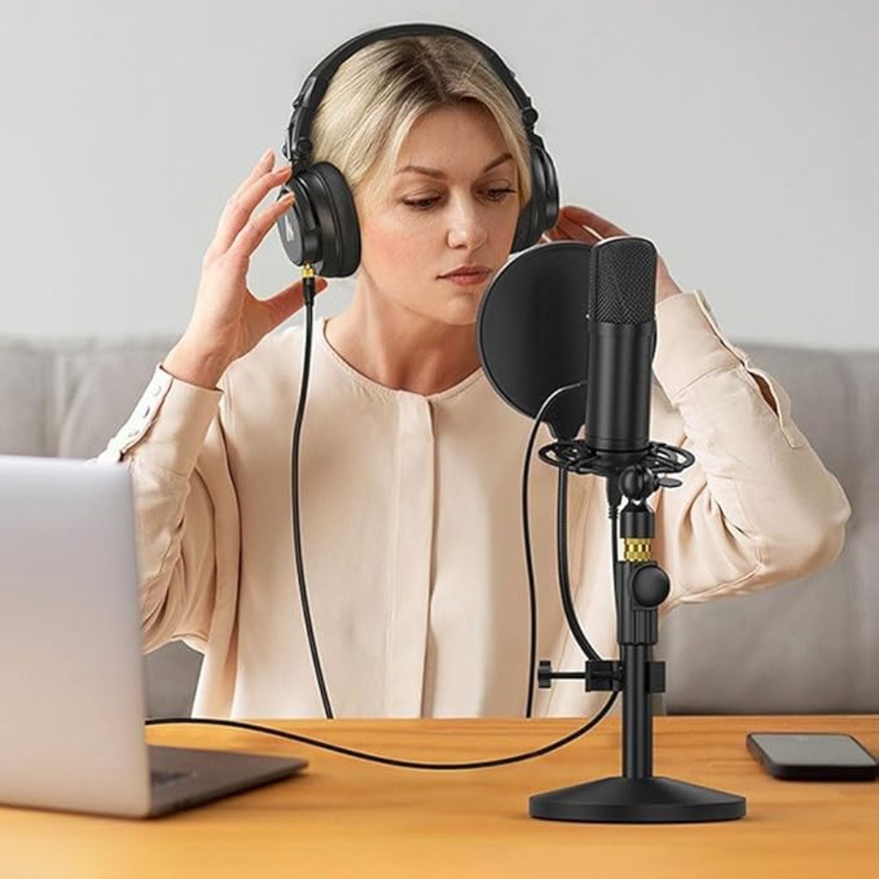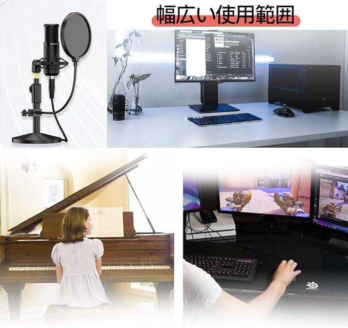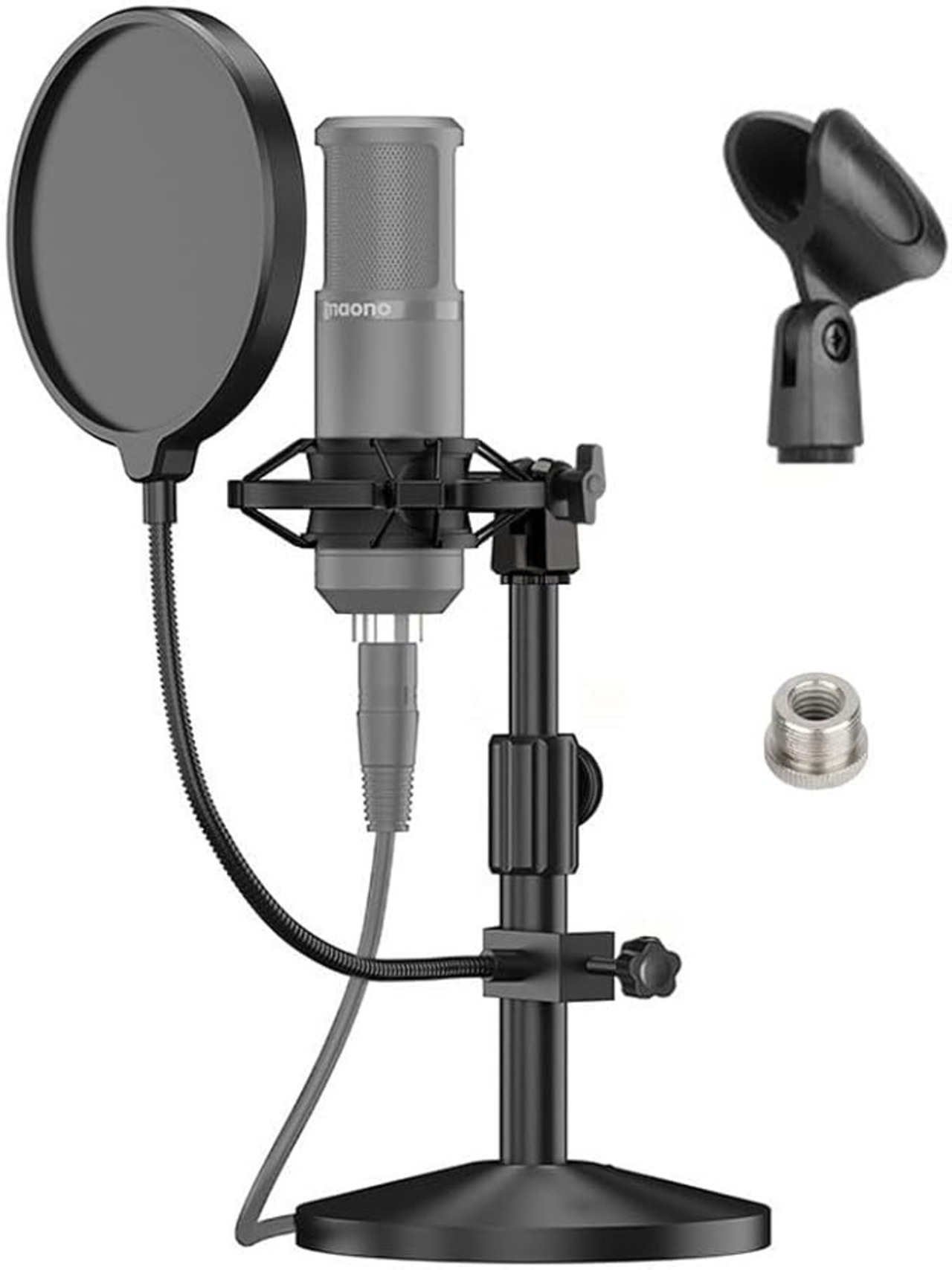 【オールインワンコンボ】調整可能なデスクマイクスタンド、ショックマウント、二層ポップフィルター、スクリューアダプター、マイクロフォンクリップが含まれています。