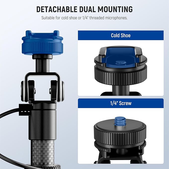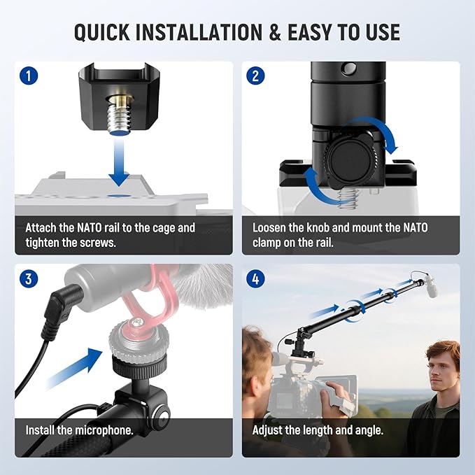 【NATOレールへの素早い取り付け】ブームポールは、NATOレールとNATOクランプを備え、カメラケージ、ビデオリグ、ショルダーリグに素早く接続します。 NATOレールが付属していないリグの場合は、1/4"ネジ付き外部NATOレールが付属しており、いつでも素早く簡単に取り付けられます。