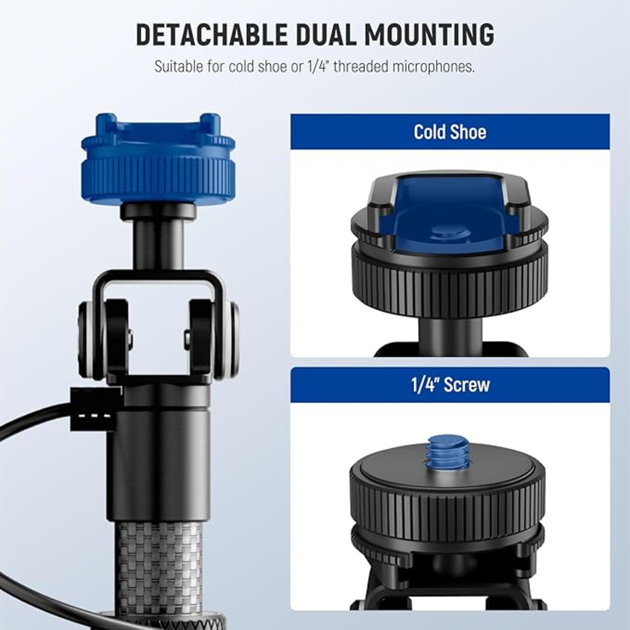 【カーボン製ブームポール】マイクブームポールはカーボンで作られ、軽量ながらも頑丈で、わずか237gという軽さであり、最大500gまでコールドシューマイクを安定して取り付けられます。NATOクランプはカメラケージに素早くしっかりと固定し、マイクをフレームから遠ざけ、インタビュー、映画制作、Vlog撮影など、一人で行う撮影に最適です。