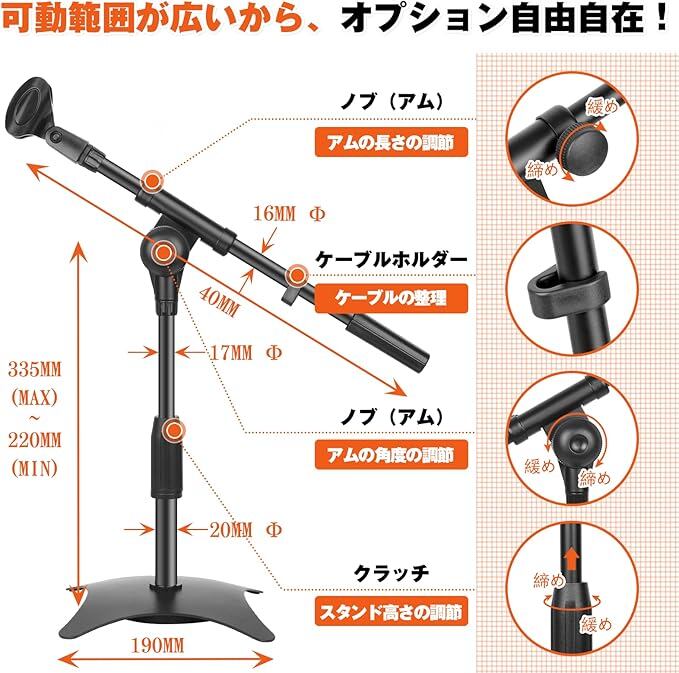 【パッケージ内容&安心な対応】:マイクスタンド本体X1(高さ:220-335mm)ブームアーム(長さ:366mm)、差し込む式ホルダーX1、ケーブルホルダーX1、土台X1(190 190mm 重さ:950g)⅝スレッドX1 。 商品に問題があった場合は、弊社までご連絡いただき、迅速に対応させていただきます