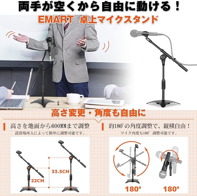 【自由伸縮&180度調整】EMARTの卓上マイクスタンドはボールヘッドにより、マイクの位置を自由に調節でき、180 回転する機構により、アームの可動域を拡大。両手が空くから自由に動けます。高さを柔軟に調節できます。マイクを安定させ、快適な高さと距離で完璧に配置できます