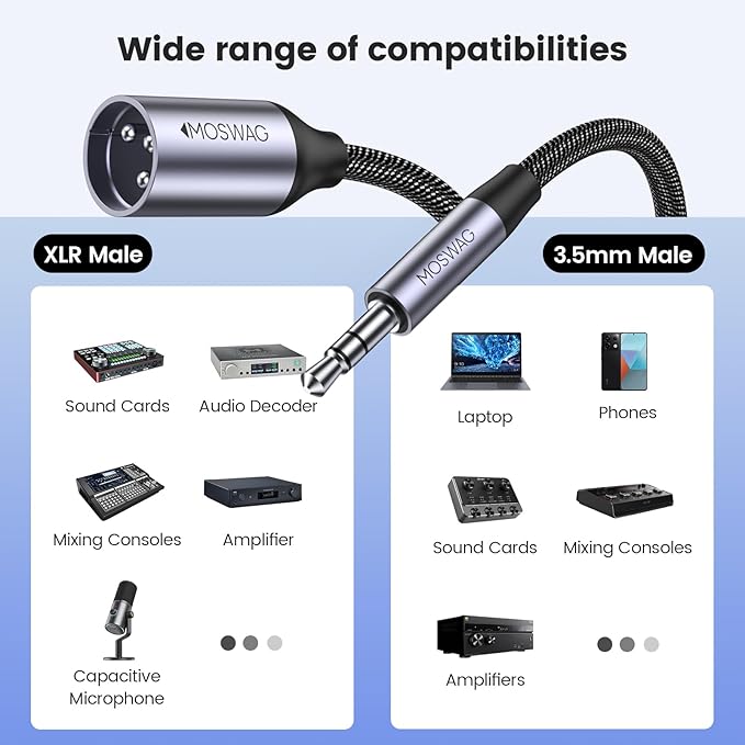 【スーパー互換性】MOSWAG 3.5 mm回転XLRケーブルは、携帯電話、タブレット、ノートパソコン、またはテープレコーダー、または3.5 mmオーディオ出力をマイク、調音台、またはアクティブスピーカーに接続してパフォーマンスを行うことができます。