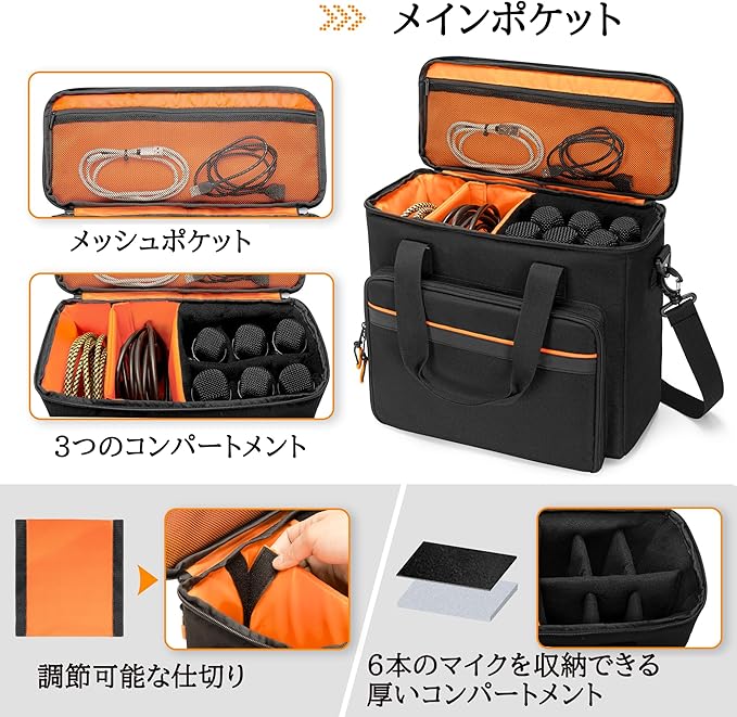 複数のポケット:大きなメインコンパートメントには6本のマイク、ケーブル、コードを収納でき、大きなフロントポケットと内部のメッシュポケットにはマイククリップ、ラベリア、充電器などを収納できます