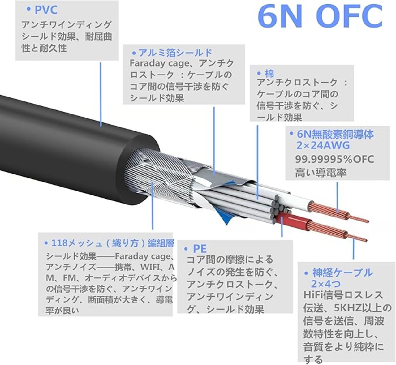 2x24 AWG 無酸素銅:高純度な6N(99.99995%)無酸素銅を採用します。単結晶、一方向性、不純物無し、優れた電気伝導率、高忠実度(High Fidelity)、低騒音、完璧な構造、理想的な材料です
