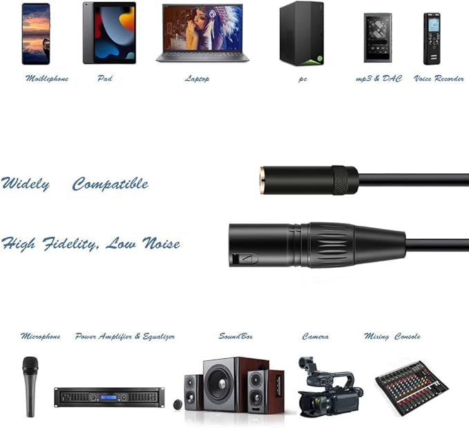 この 3.5mm xlr ケーブル は ステレオ接続です。でも、ほとんどの一つのXLRの出力/入力デバイスはモノラルです。ですから、伝送がモノラルか、ステレオかは、XLRのデバイス次第です。3.5mm xlr 変換 xlr 3 to 3.5 mm ケーブルは 3.5 mm ステレオミニプラグメスを持つ機器とXLRオスを持つ機器の接続に最適な 3.5mm メス xlr オス ケーブル で、3.5 mm メス 3 極 変換 キャノン ケーブルです