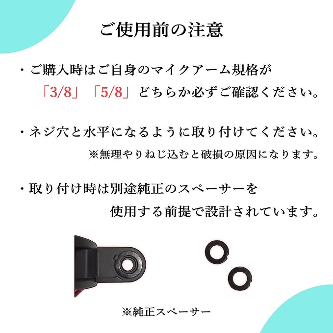 HyperX QuadCast,QuadCastS,DuoCastの購入時に付属するマイクマウントアダプターと互換性があります。 <br> マイクアームとの取り付けに使われる規格は、主流となっている「3/8 AKG規格」と「5/8 SHURE規格」の種類を用意しております。 お使いのマイクアームの仕様をご確認いただき、お間違いのないようにご選択ください。
