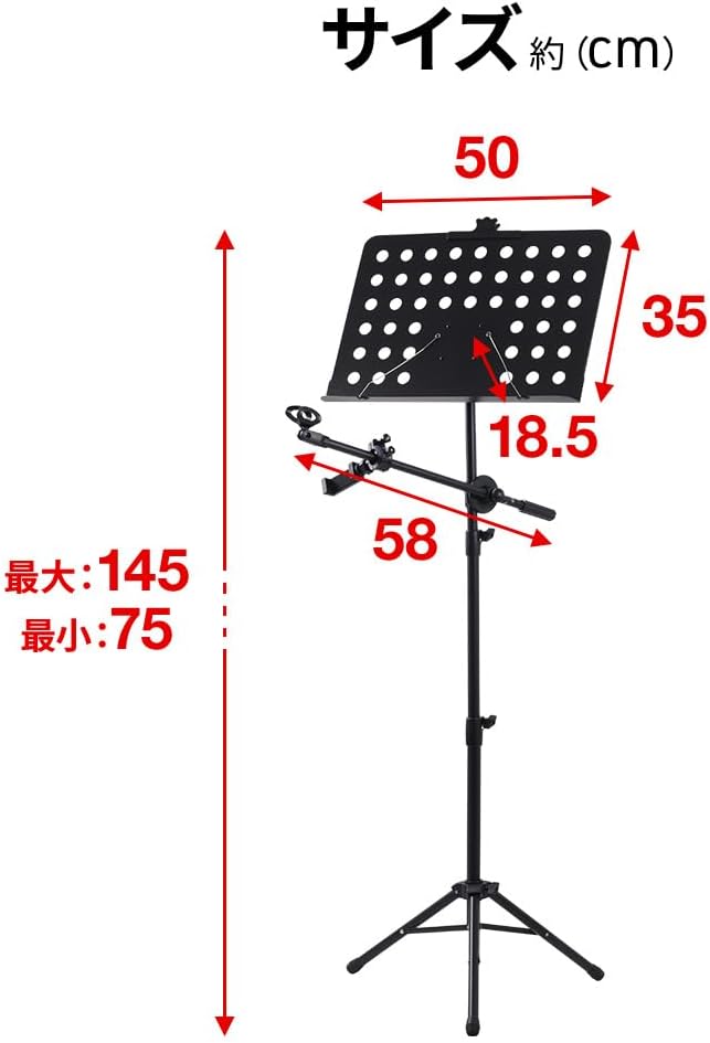 商品詳細/カラー:ブラック/素材:スチール/高さ:75~145cm/譜面置き部分サイズ:幅50 高さ35cm/耐荷重:約2kg