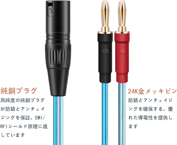 銀メッキ処理を施したXLRステレオキャノンコネクター(オス)とバナナ(オス)プラグを採用し、さびに強く、経年変化による信号劣化の心配が少ない、信号のパフォーマンスを向上させます。銀メッキ処理を施したのXLRキャノンジャックを採用し、伝送ロスを最小限に抑えます