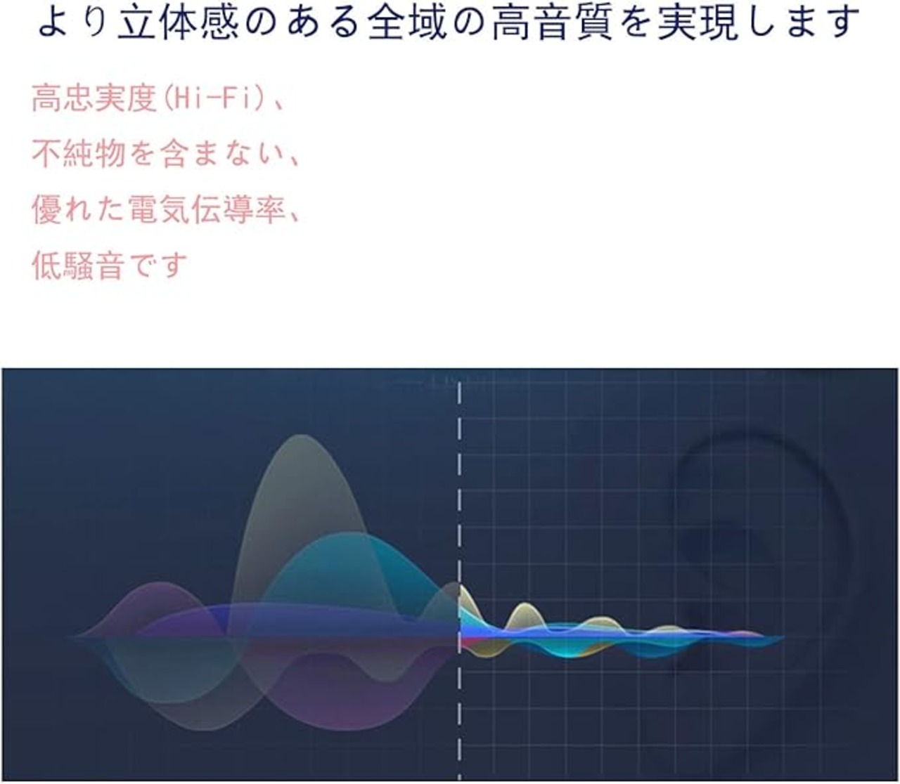 無酸素銅:高純度な6N(99.99995%)無酸素銅を採用します。単結晶、一方向性、不純物無し、優れた電気伝導率、高忠実度(High Fidelity)、低騒音、完璧な構造、理想的な材料です。信号伝送が5kHzを超え、ハイファイ(Hi-Fi or HiFi)の高音質の再生が可能になります。オーディオマニアとホームオーディオ愛好家に、高忠実度(Hi-Fi)と高音質な音楽を提供します