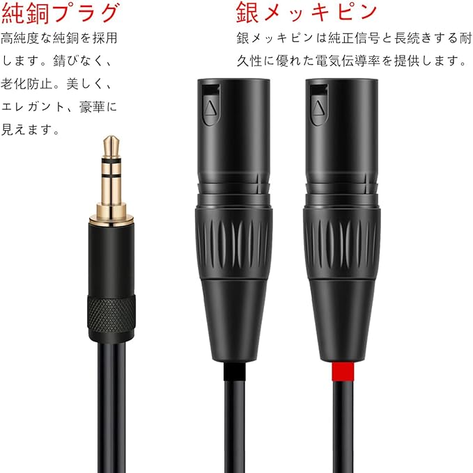 24K金メッキ3.5mmプラグは純銅を採用します。錆びなく、老化防止。プラグは純正信号と耐久性に優れた電気伝導率を提供します。耐食性と耐摩耗性を持ち、電気抵抗が低いです。極端な温度(–60 C - 750 C)でも耐久性と安定性を持ちます。XLRキャノンジャックは高品質のメタルを採用します。3.5mmとXLRコネクターは10000回以上の挿入および引抜試験に合格しました