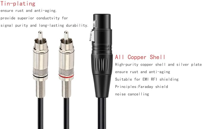 キャノン rca 変換 : キャノン 3 ピン コネクタは純銅を採用します。 キャノン 変換 rca : 錆びにくい、経年変化に強い。3pin xlr プラグは最良な信号伝送を実現し、長続きする耐久性に優れた導電率を提供します。高域の滑らかさや中低域の厚みを感じられます 。きれい、エレガント、華やいに見えます。優れた耐食性と良い耐摩耗性、電気抵抗が低いです。極端な温度でも安定性と耐久性を持ちます。10000回以上の挿入および引抜試験に合格した キャノン rca ケーブル
