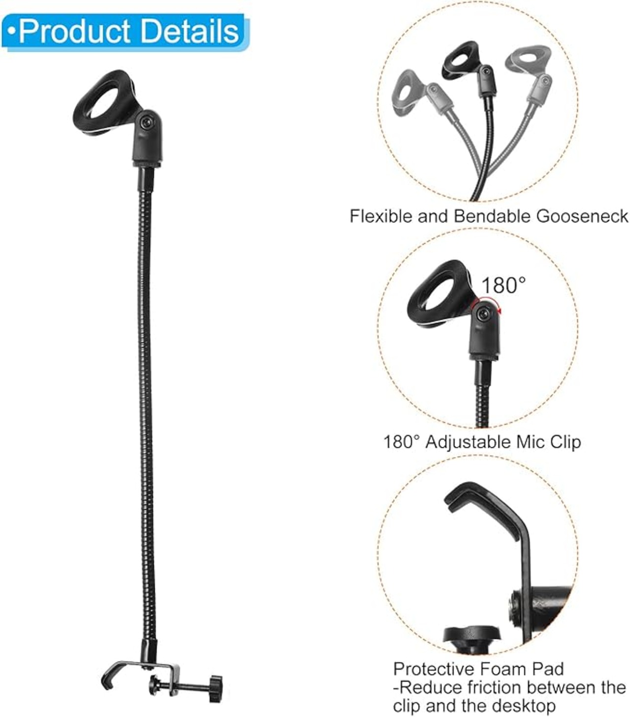 2. 柔軟で曲げられるグースネックは 180 度曲げることができ、任意の角度に調整できるため、さまざまなニーズに対応できます。マイク クリップは 3/8 "から 5/8 "へのアダプターを使用して設計されているため、さまざまなマイクに合わせてサイズを簡単に変換できます。