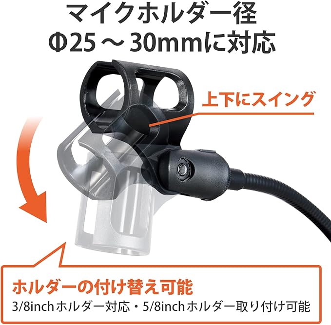 ■マイクホルダー部分は、お手持ちのホルダーに付け替えて使用可能です。3/8インチのホルダーに対応します。