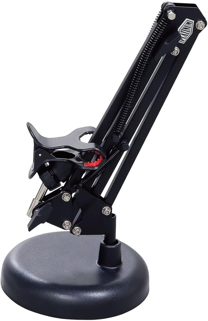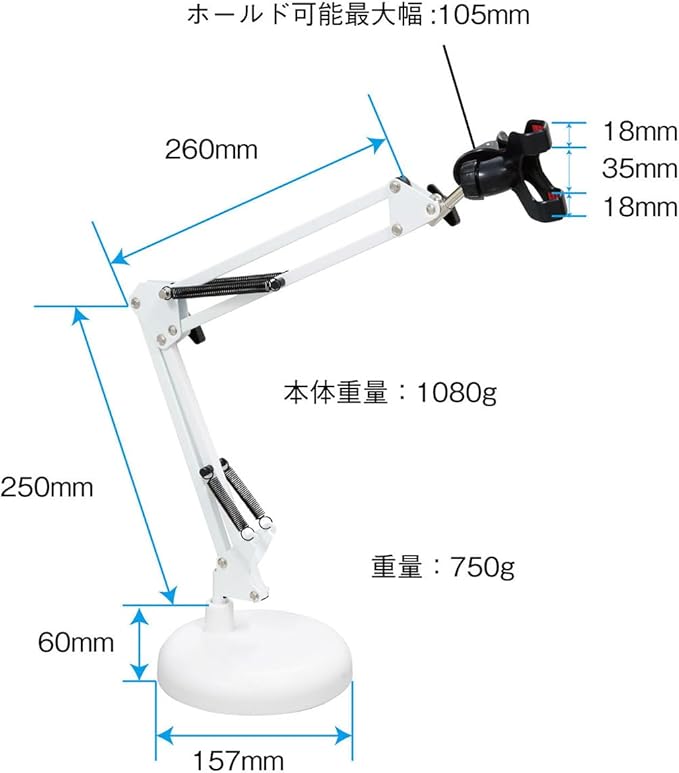 スプリングアームの卓上スマホスタンドです。自在に位置の調節が可能で、動画視聴はもちろん、キッチンでレシピを見ながら料理をする際、さらには真上からのアングルで両手で作業する、料理動画やソーイング動画を撮影する際などに活躍します。ベースは直径157mmで、作業の邪魔になりにくいコンパクトな仕様です。使わない際は折り畳んで収納可能。スプリングアームはジョイントのネジを緩めてもバランスを維持するので調節がしやすく、丈夫なのも特徴です。