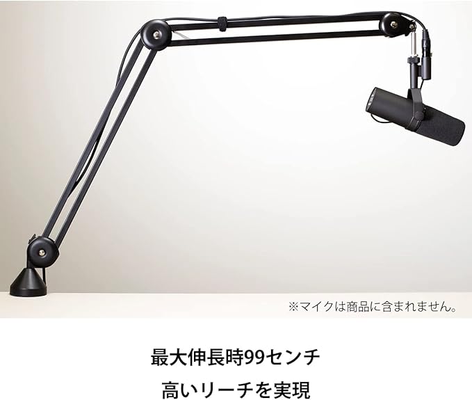 最大伸長時は 99 センチと高いリーチを実現。シザー・スタイルの柔軟なテンション機構により、なめらかにマイクの位置を変えることができ、多様なポジショニングを可能にします。