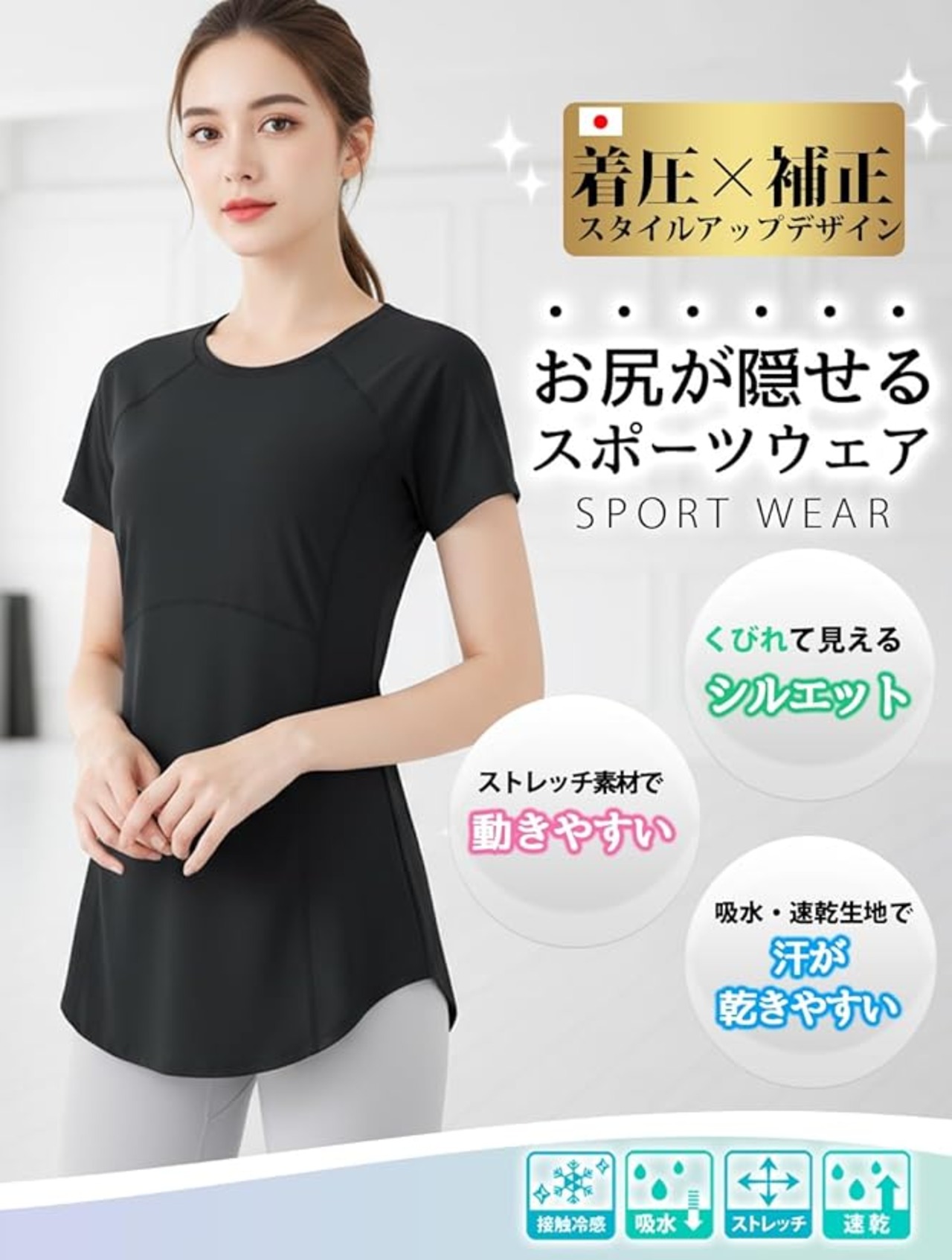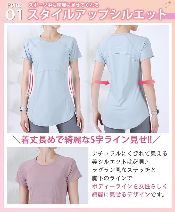 [Ranmy Stage] 【くびれシルエット】 ヨガウェア トップス 半袖 スポーツTシャツ レディース 体型カバー 速乾 薄手 丈長め 伸縮性 スポーツ ジム トレーニング ランニング ウェア