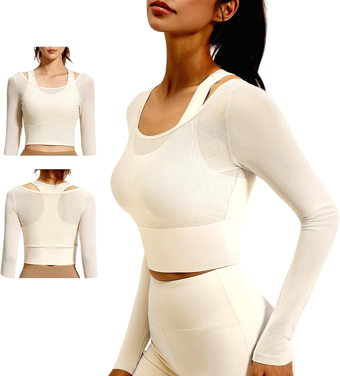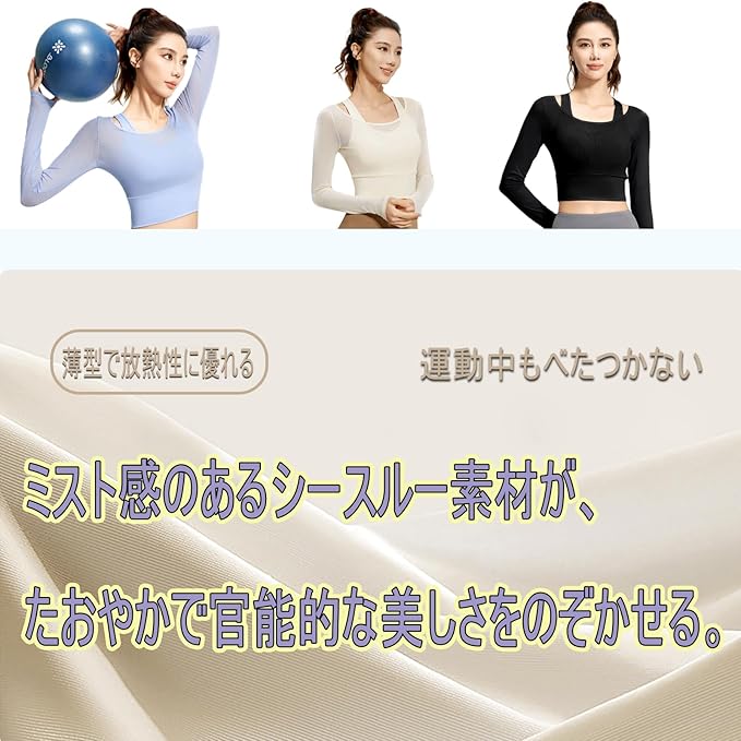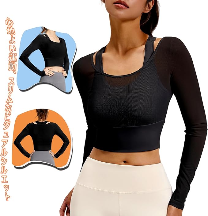 [Yodilala] メッシュパネルレイヤードトップ フィットネス スポーツ ピラティスワークアウトウェア カップキ長袖ヨガシャツ 吸汗速乾