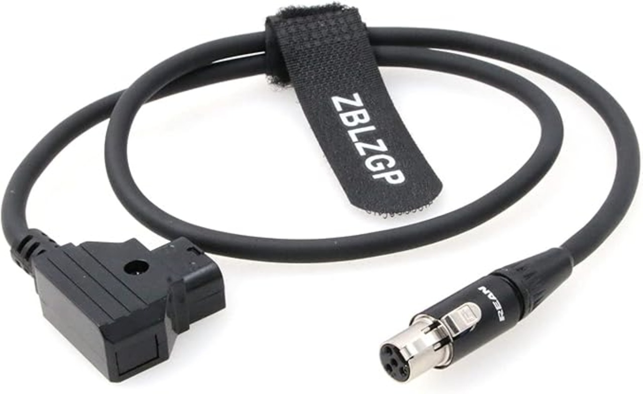 このミニ 4ピン メス XLR → オス D-Tap ケーブルは、D-Tap 電源出力に接続し、ミニ 4ピン XLR 電源入力ポートを使用するデバイスに電力を供給します。