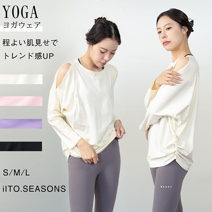 [iito.seasons] ヨガウェア レディース トップス 丈長め 長袖 オープンショルダー ドルマンスリーブ ゆったり フィットネスウェア 体型カバー ロング丈 冷感シャツ 薄手 吸汗 速乾 UVカット 紫外線対策 おしゃれ 人気