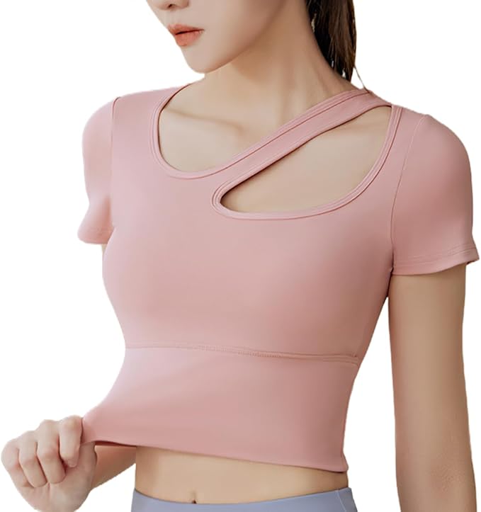 [SLINX] レディース ヨガウェア カップ付き 半袖 tシャツ トップス ヨガ 揺れない かわいい オープン 無地 軽量 速乾 ストレッチ スポーツウェア フィットネスバレエ ダンス YDX02