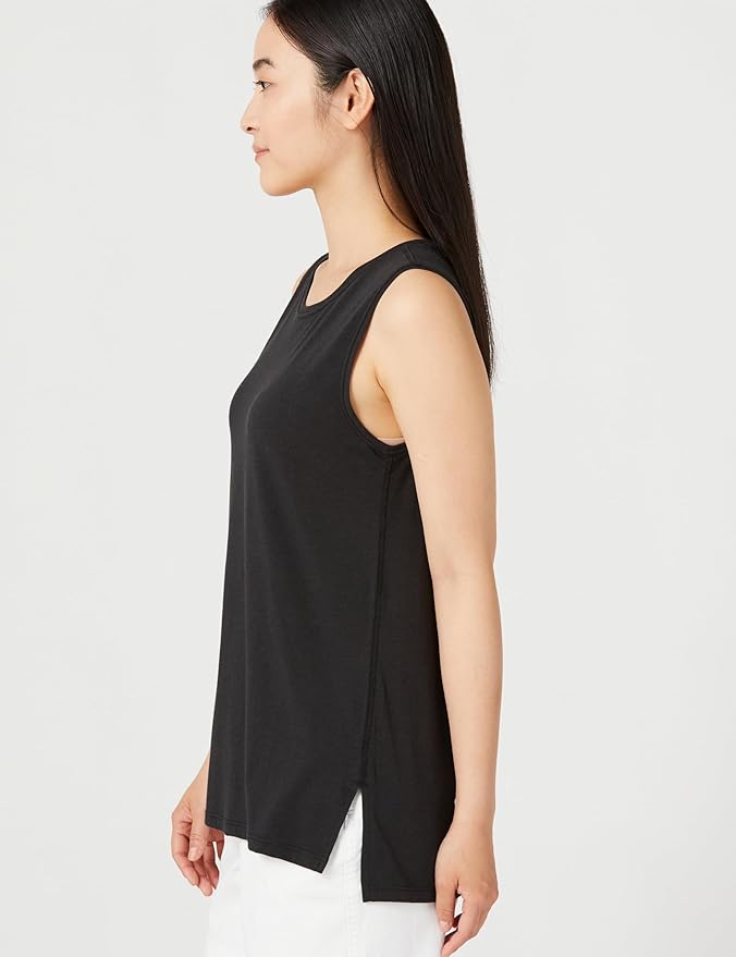 Amazonブランド - ヨガスタジオなど用に作られたこの多用途ノースリーブタンクは、優れたカバー範囲を提供し、どこにでも持ち運べるように設計されています。