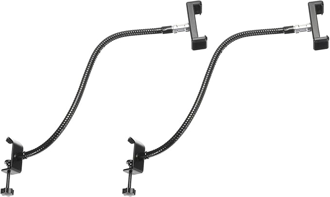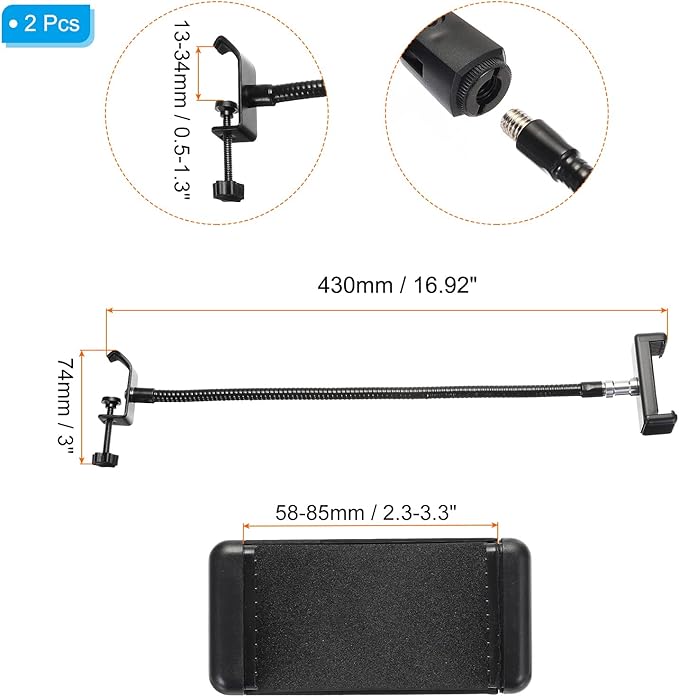 仕様: 仕様; 全体サイズ: 470 x 74 mm (長さ*幅); チューブ外径: 10mm ; オスねじサイズ: 3/8"; 携帯電話クリップサイズ: 58mm~85mm; マイク クリップサイズ: 12mm~34mm; 材質: 金属; カラー: 黒; 梱包内容: グースネックチューブ2個、クリップ2個、電話クリップ2個、3/8"~5/8"のマイクアダプター2個。