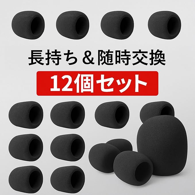 マイクカバーは、比較的早くボロボロになりがちですが、12個セットにてご用意いたしましたので、頻繁に交換を行うことが可能です。