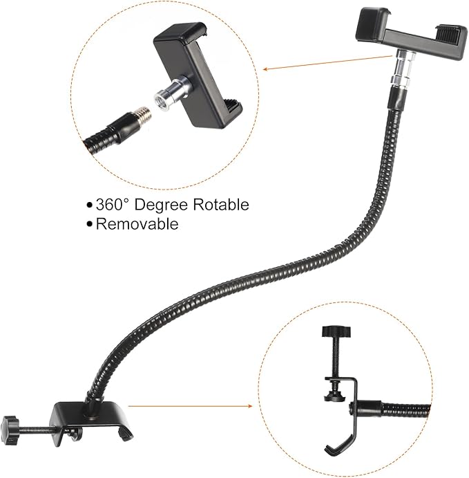 手順: マイク クリップをテーブルなどの場所にクリップし、電話クリップを開いて電話を固定します。要件に合わせて金属ホースの曲がり具合と位置を調整します。安定性と信頼性を確保するために、確実な取り付けをお願いします。