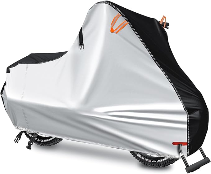 2025年最新の自転車カバー。300Dの極厚素材を採用し、雨・風・砂ホコリからしっかり愛車を守ります。撥水加工とUVプロテクトで全天候に対応。二重ステッチ構造で破れにくく、長く使えます。飛散防止ベルトとロックホール付きで防犯対策も安心。29インチまで対応、収納バッグも付属。