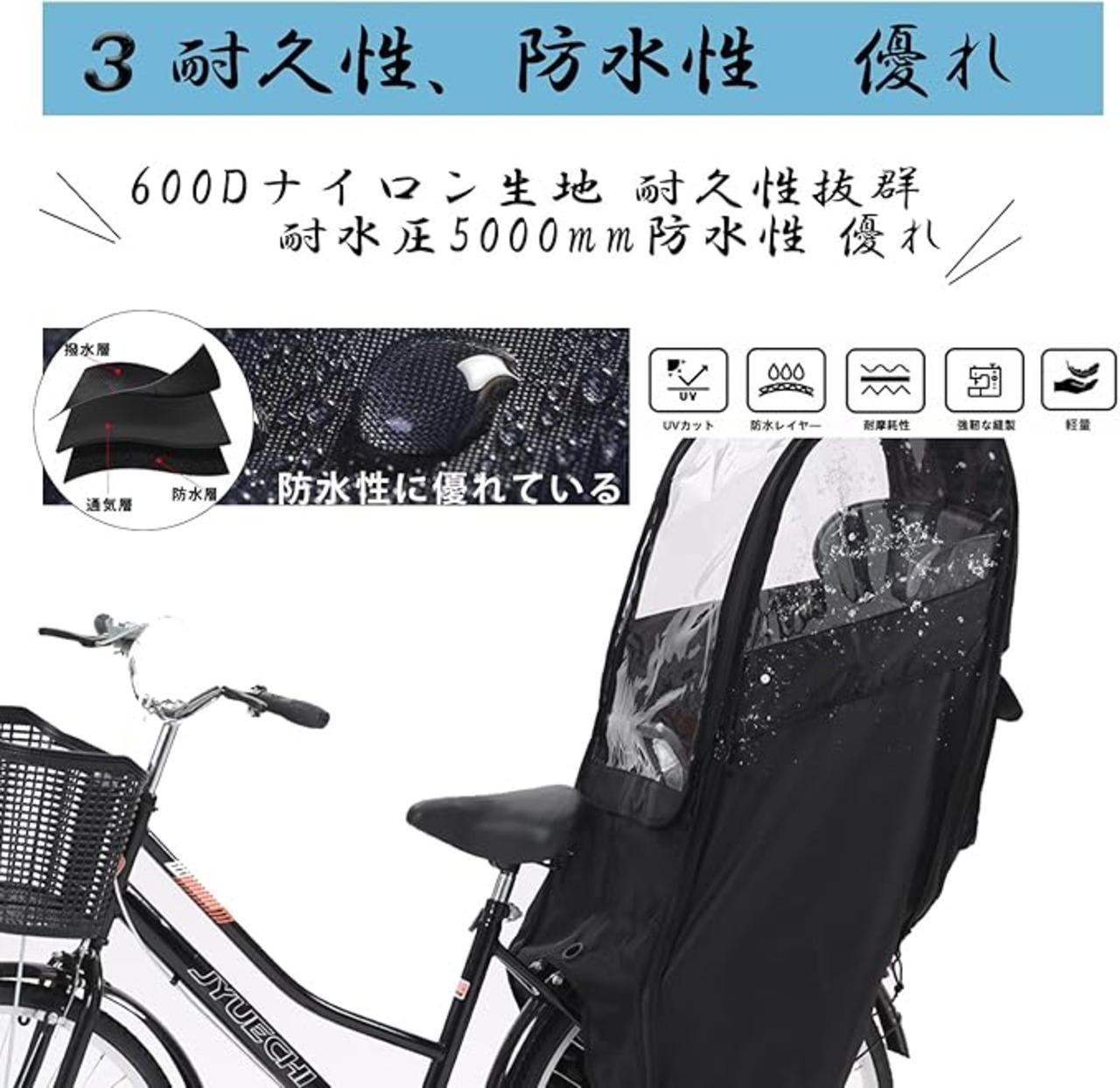 【防水・耐久性が更にアップ】本体生地は耐久性に優れた600Dナイロンが採用されて、従来のレインカバーより耐久性が更にアップ!高品質の生地を採用しているほか、耐水圧加工(5000mm)も施されているので、水分が生地の内側まで染み込みません。