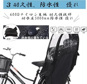 【簡単装着・大きなポケット】ヘッドレストを最も高い位置まで上げて、レインカバーを上から被せ、取付けベルトを巻いたらカバーを取り付け完了。背面部分には大きなポケットをつけました。自転車に乗る時に必要ある物を収納します。