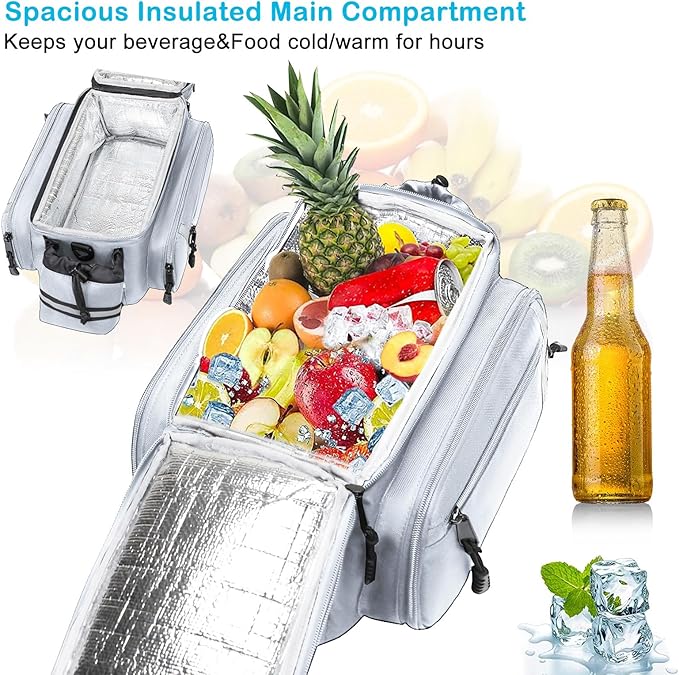この自転車ラックバッグは防水ポリエステル素材で作られています。防水レインカバーが付属し、雨水からサイクルバッグ全体を完全に保護することができます。インナーには断熱材が入っており、飲み物や食べ物を何時間でも冷たく保ったり、温めたりすることができます。また、新鮮な果物やスナック、飲み物を入れることもできます。